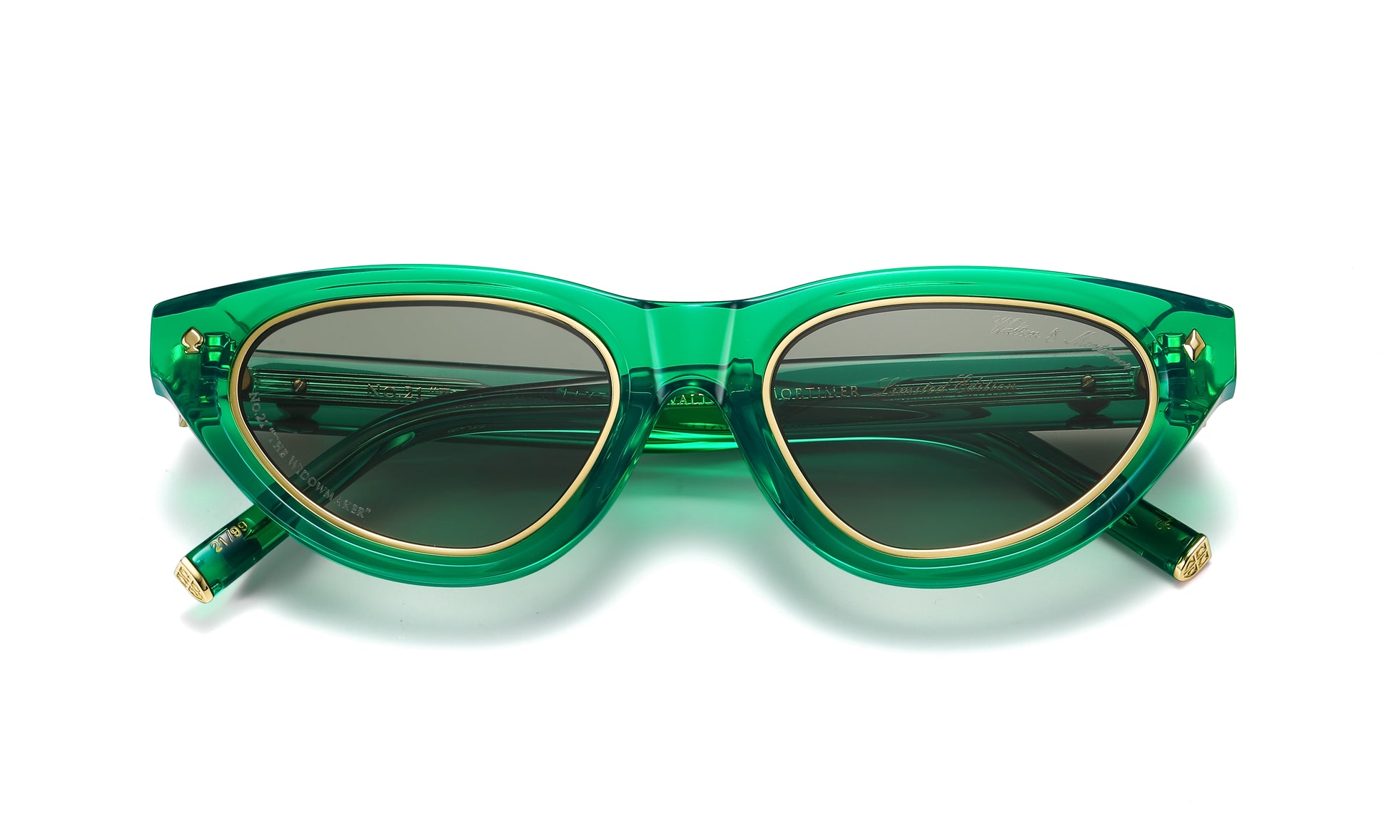 Introducing the No.21 "The Widowmaker" sunglasses, a stunning Japanese eyewear frame from our exclusive "Runway Collection." Featuring 24 carat gold-plated elements, these sunglasses are the epitome of luxury for women. Limited to only 99 individually numbered units in the striking "Poison Green" color.
